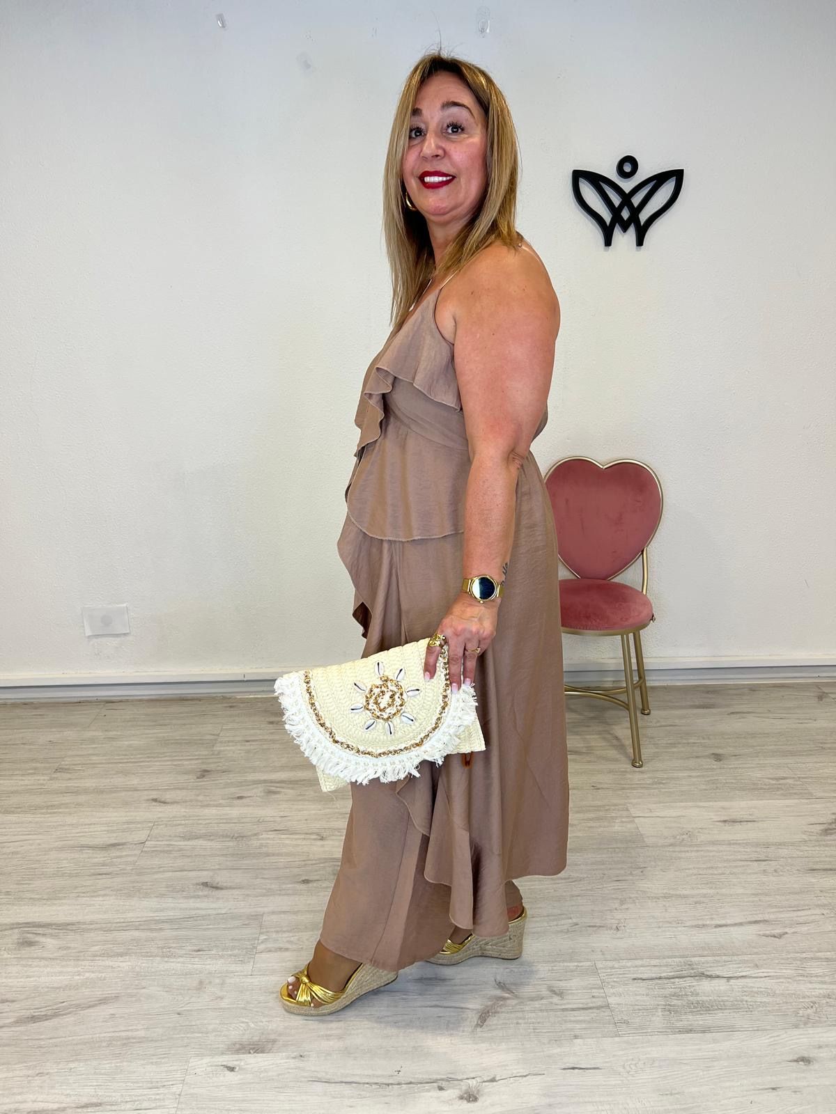 Bolso cartera bandolera y de RAFIA , de color BEIGE. Asa larga bandolera Y de PULSERA. Ideal para una ocasión especial y para looks también casual.