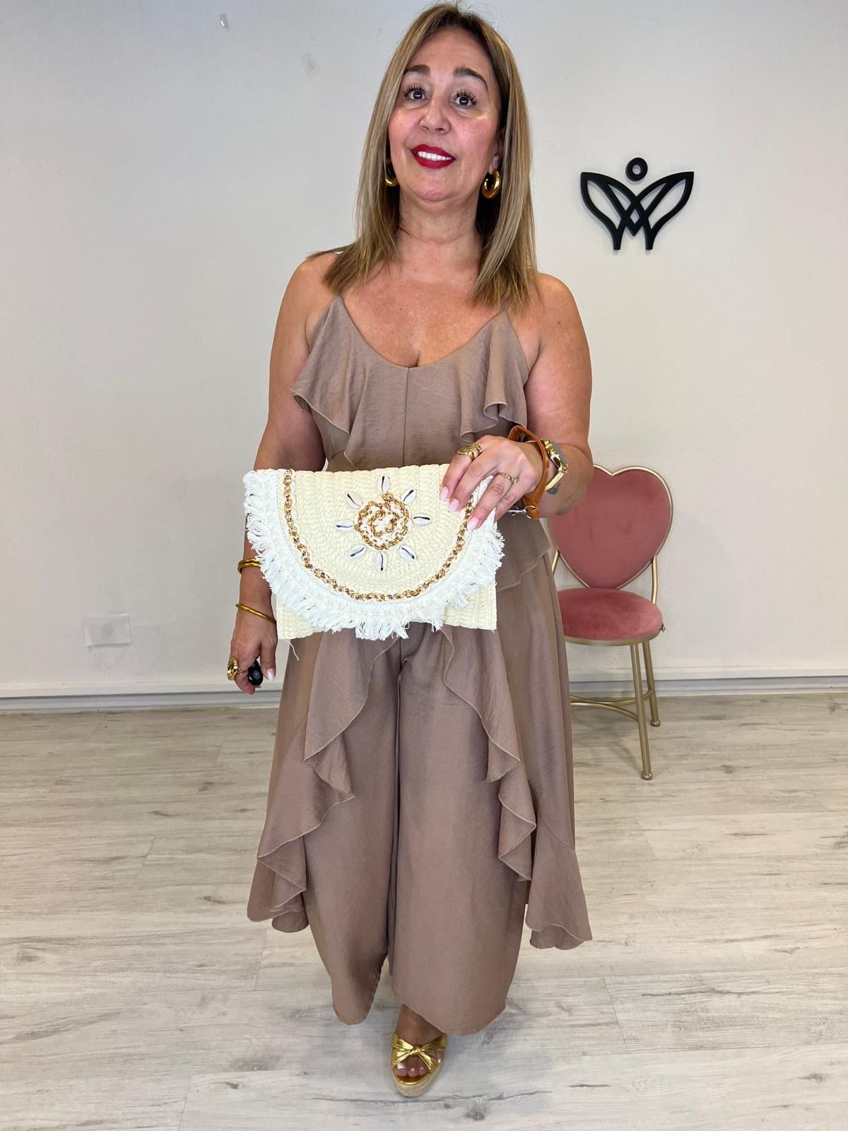 BOLSO CARTERA CUADRADO ABALORIOS Y CONCHAS RAFIA BEIS