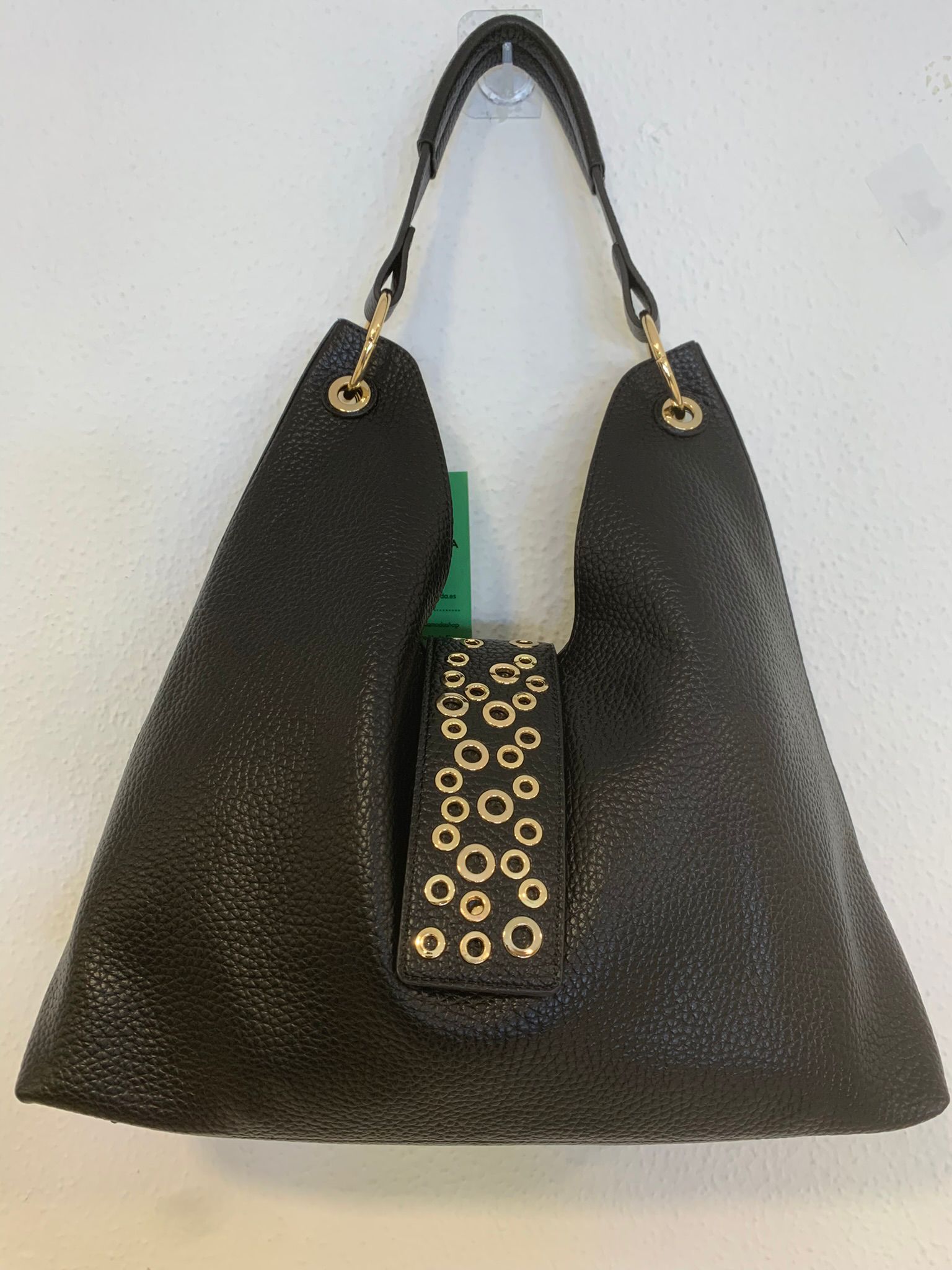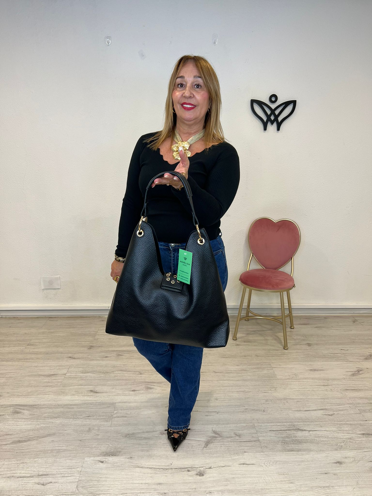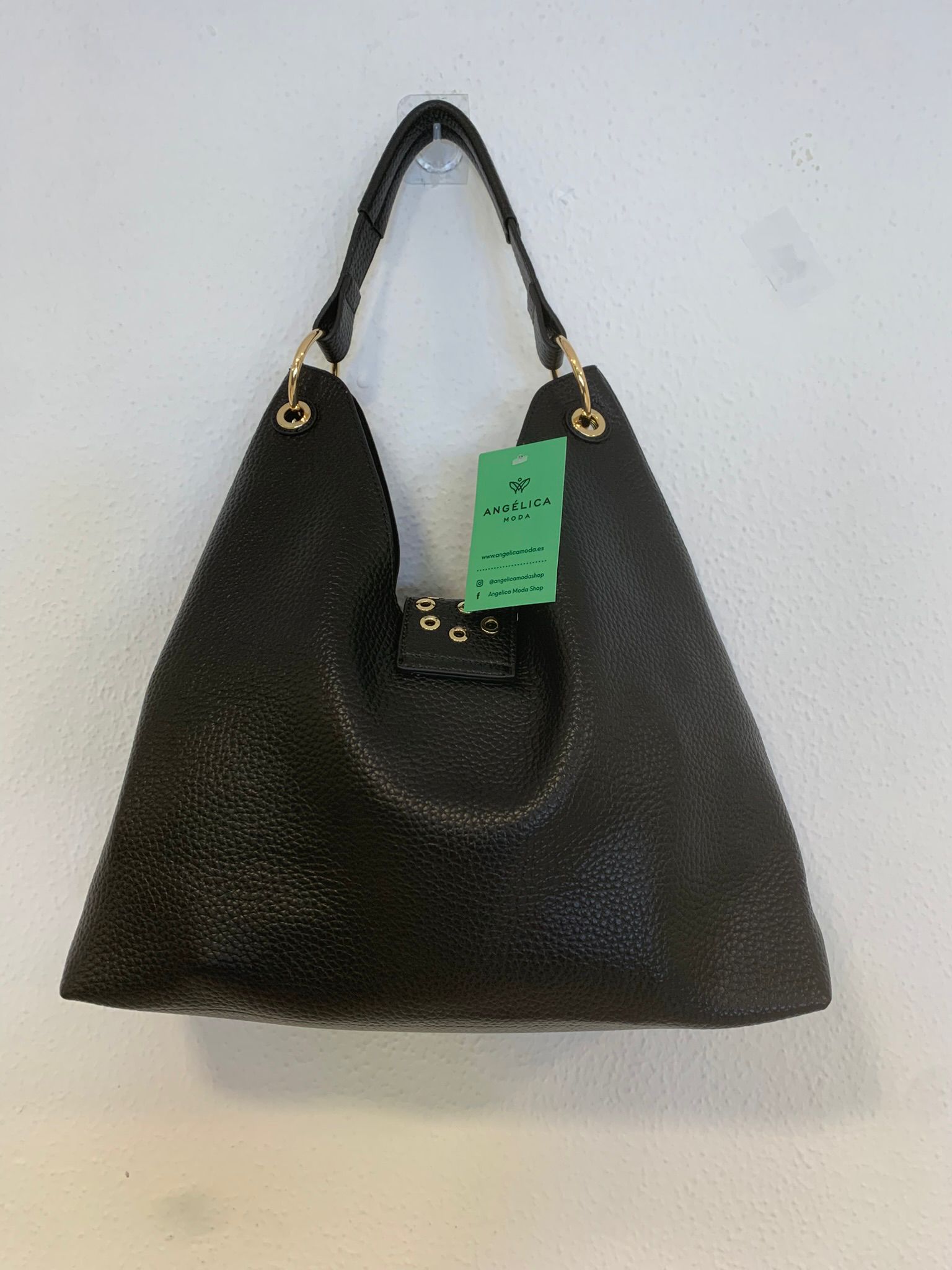 BOLSO POLIPIEL MEDIA LUNA CIERRE DETALLES DORADOS NEGRO