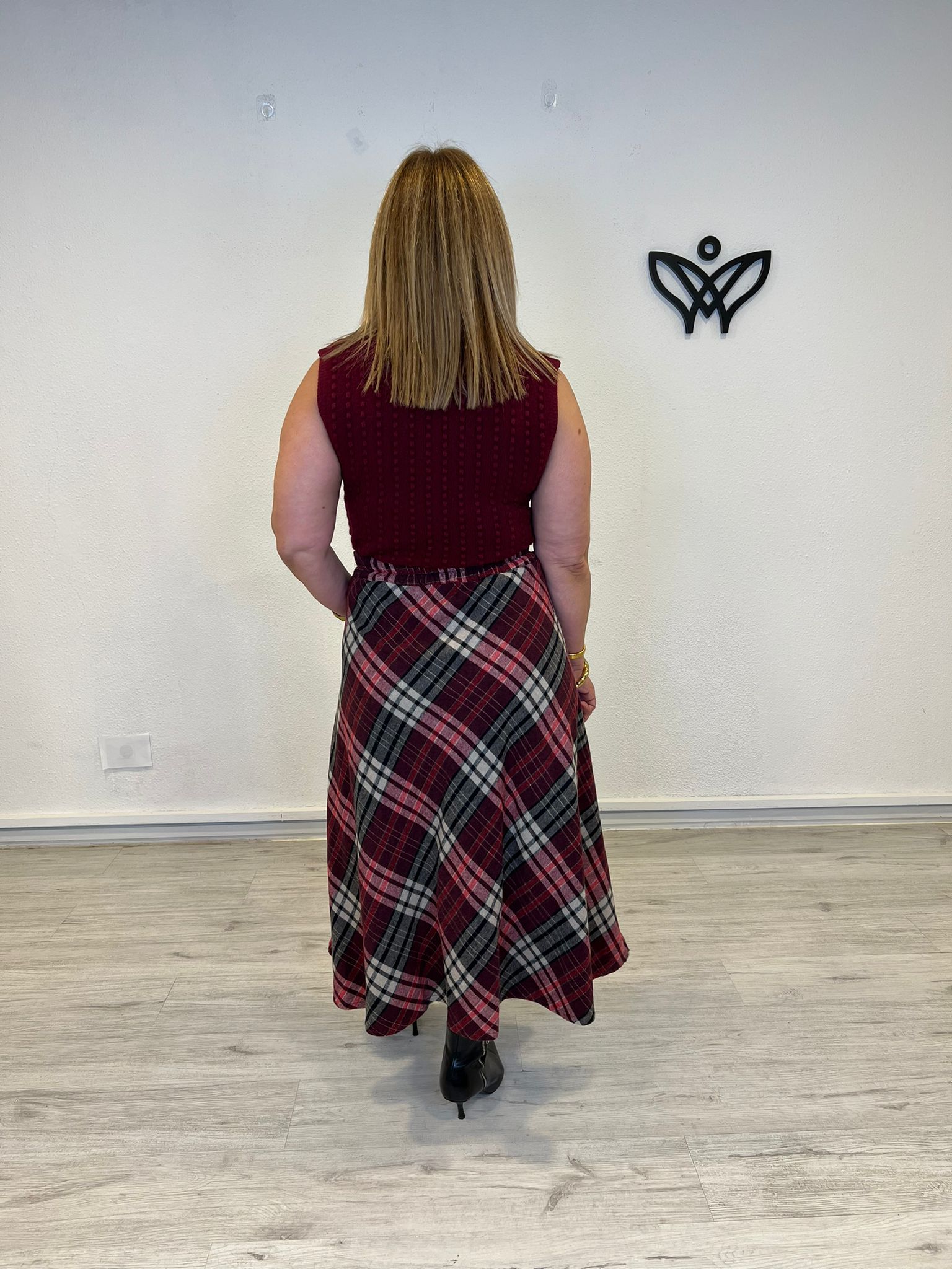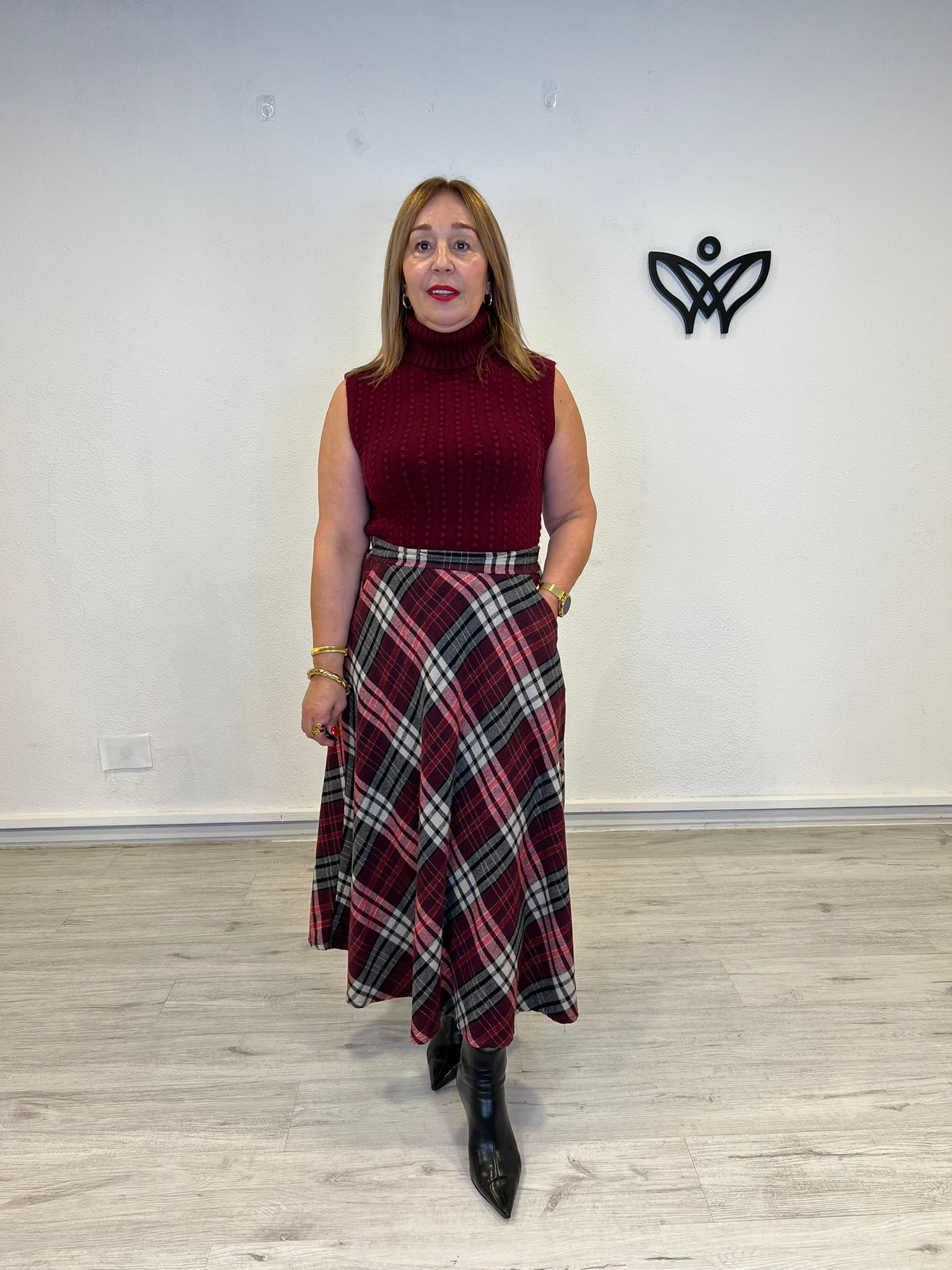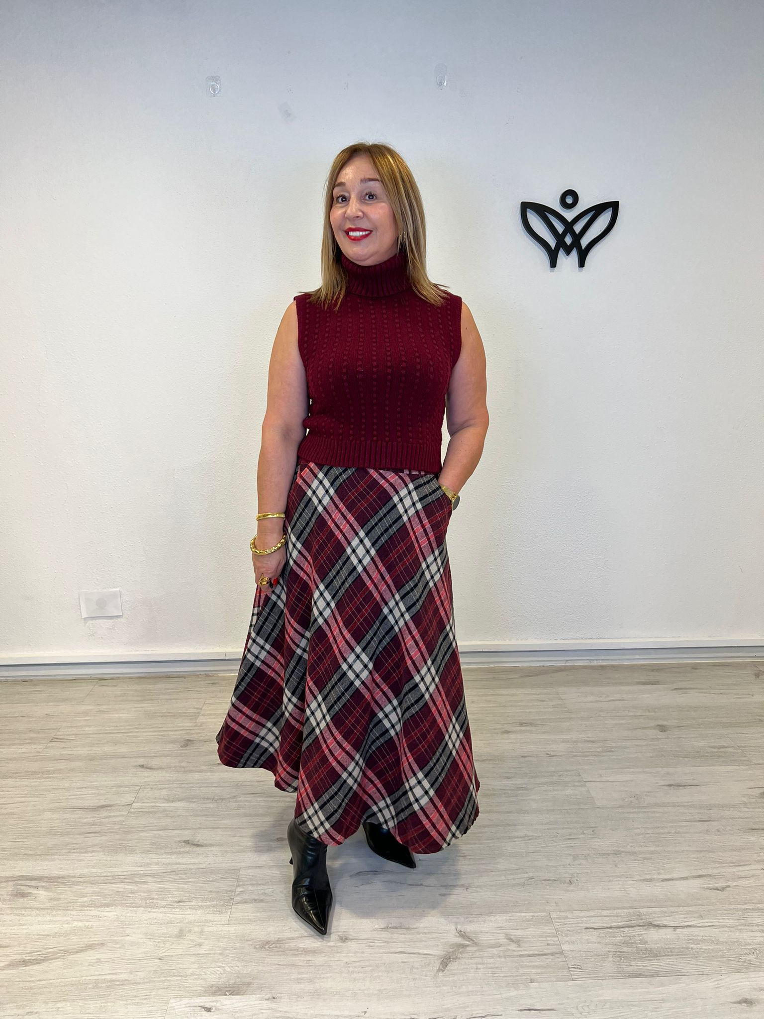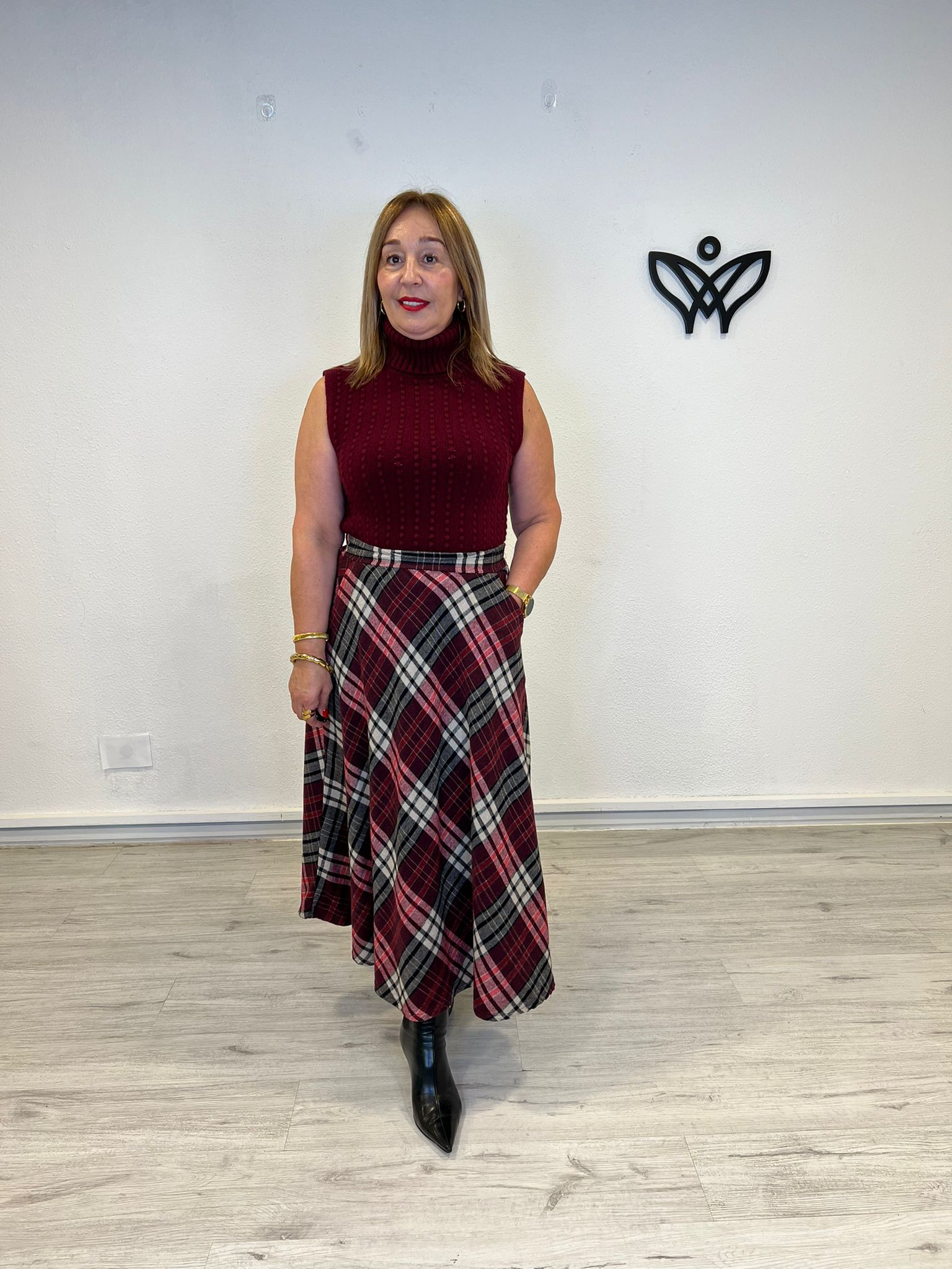 FALDA DE CUADROS EVASE CON BOLSILLOS BURDEOS