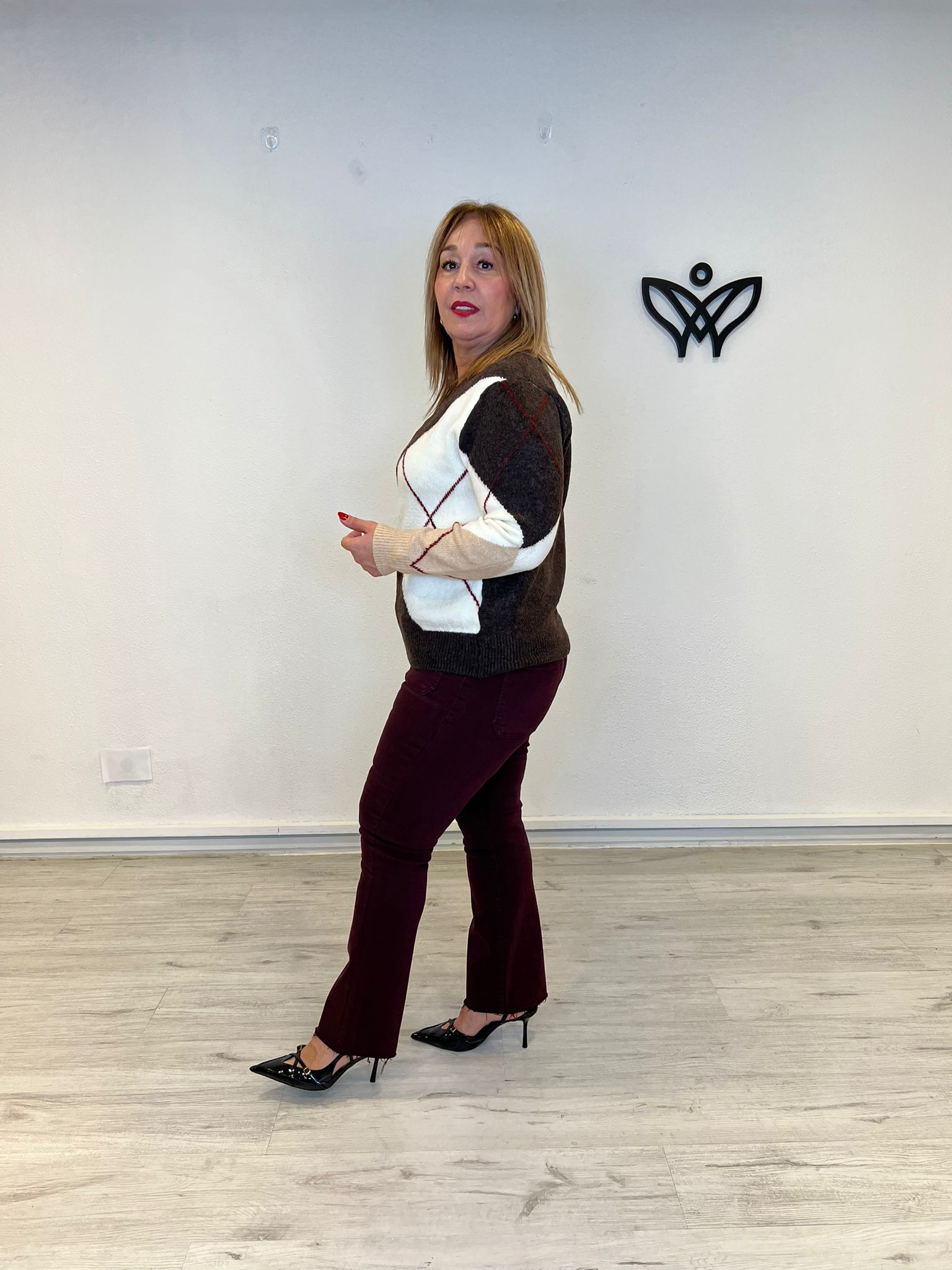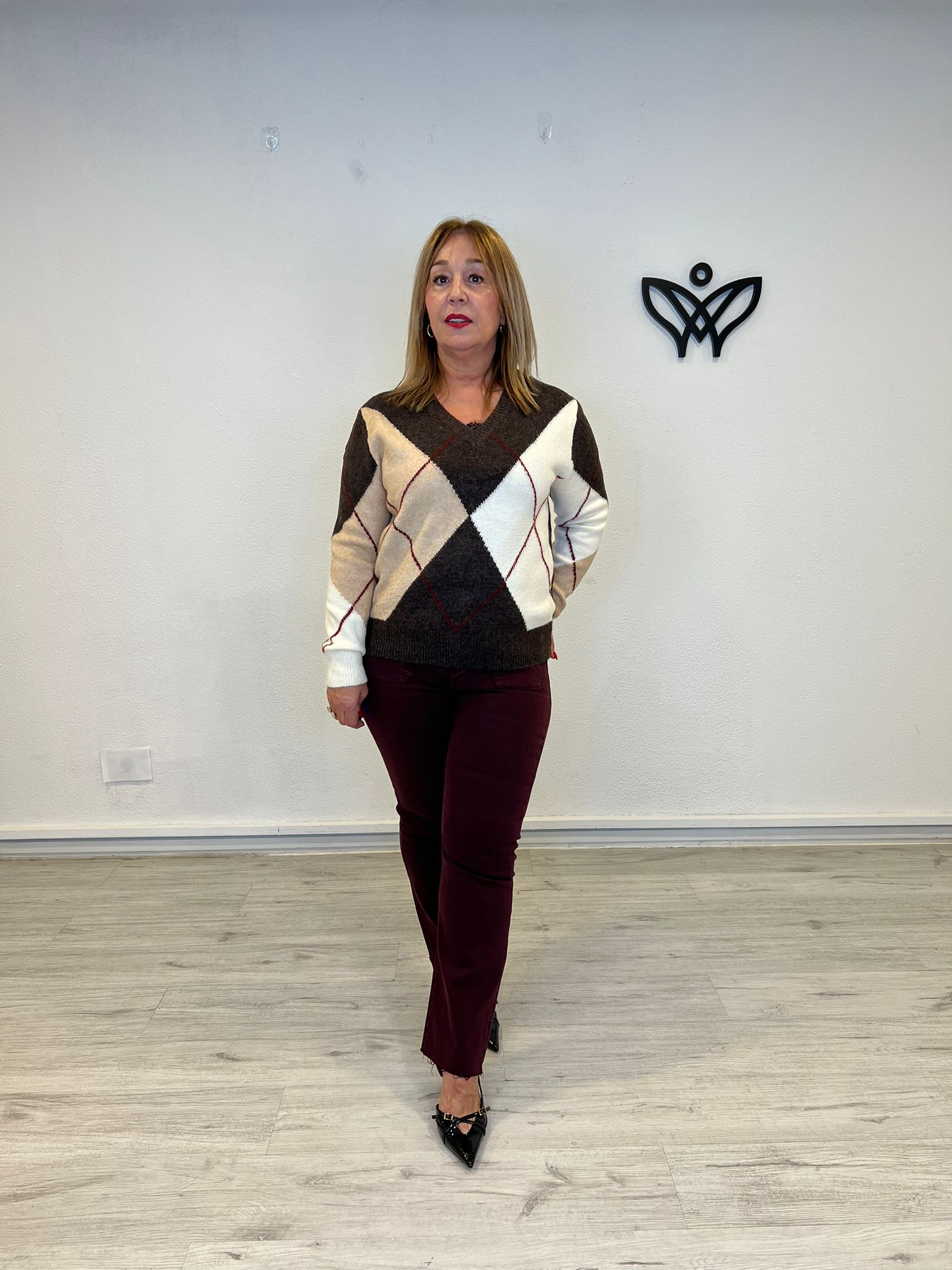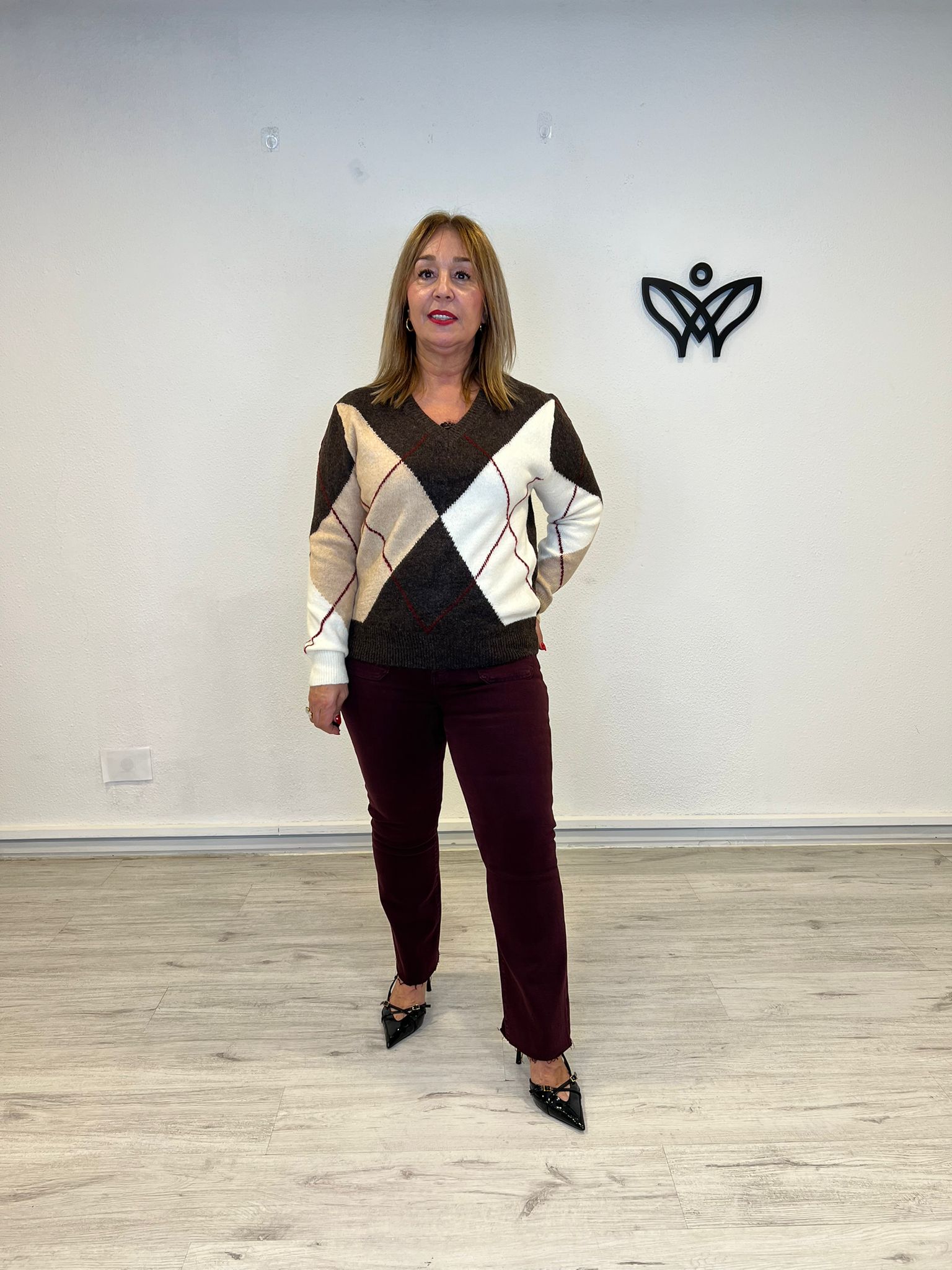 JERSEY DE PUNTO ESCOTE EN PICO ROMBOS MARRON CHOCOLATE cantidad