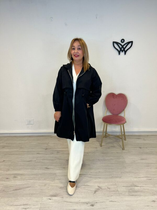 65,00 €El precio original era: 65,00 €.52,00 €El precio actual es: 52,00 €. - 20%TRENCH GABARDINA CAPUCHA CREMALLERA NEGRO
