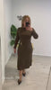 Talla única se adapta para la 36, 38 y 40. Vestido midi de licra marrón chocolate, manga larga y muy favorecedor. Elegante, cómodo y perfecto para eventos o diario.